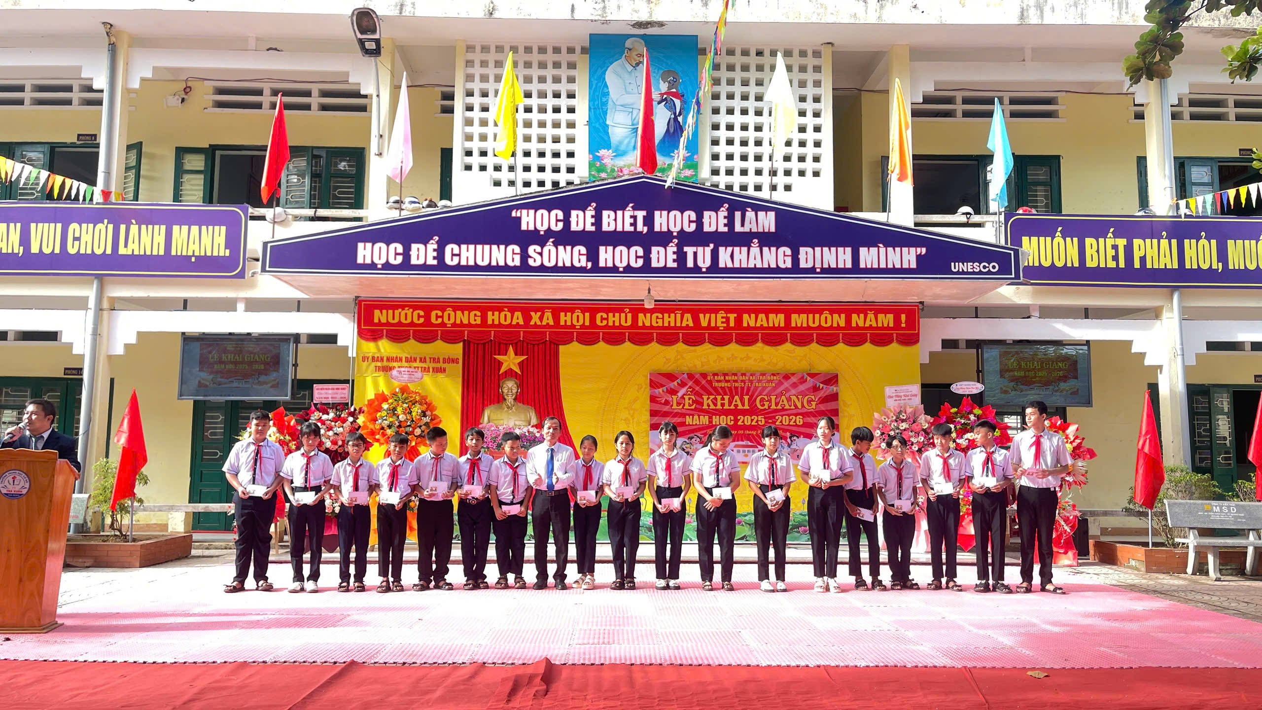 Trong buổi lễ khai giảng, Nhà trường đã trao các suất học bổng cho các em học sinh có hoàn cảnh khó khăn để cổ vũ tinh thần học tập và kịp thời động viên, khích lệ các em trong năm học.